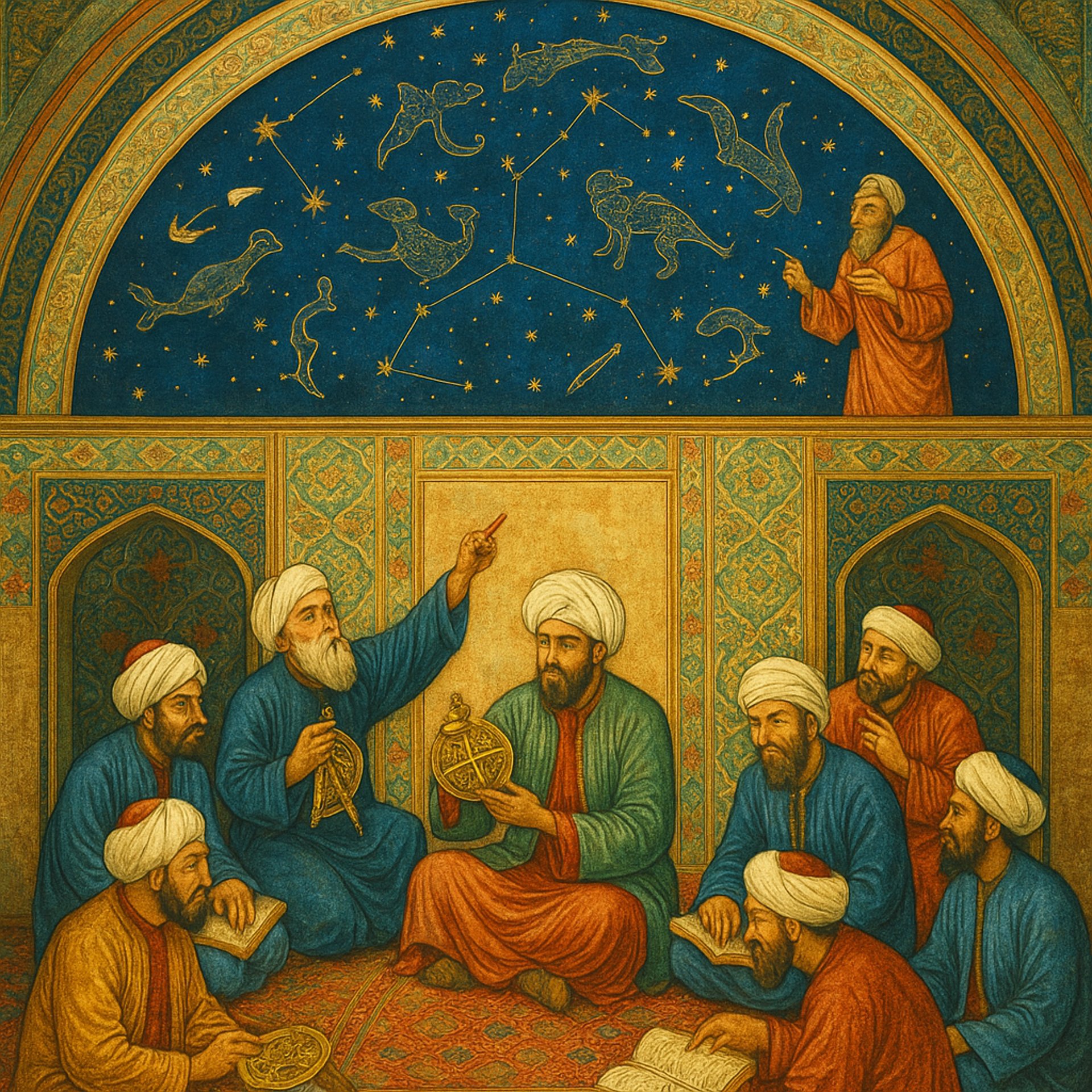 Between the 8th and 13th centuries, the light of knowledge burned brightest in the House of Wisdom of Baghdad. Here, scholars looked not only toward the stars but deep into the divine mysteries they carried. Under golden domes and oil lamps, the hum of intellect filled the air — Arabic translations of Greek, Persian, and Indian texts flowed like rivers of wisdom through the Islamic world.